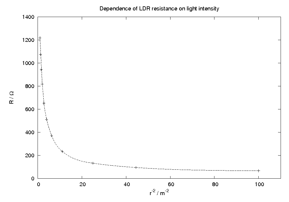 The light intensity is proportional to the reciprocal of the square of the distance from the light source, and this was plotted against the LDR resistance in the graph below (click on graph for higher resolution image, also available as a PDF here):